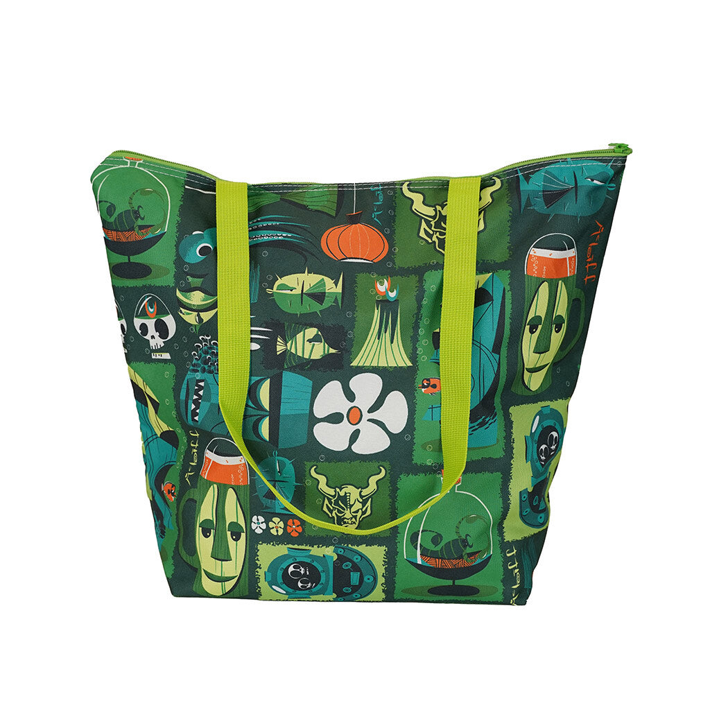 Zippered tote bag with same 100% polyester material as our 2021 tiki shirts. Custom designed by SoCal artist Mcbiff. Inner lining features excess material from 2020-edition tiki shirts. Size: 18Ó wide x 16Ó tall. Online exclusive. Not available at Stone Brewing Tap Rooms or Bistros.