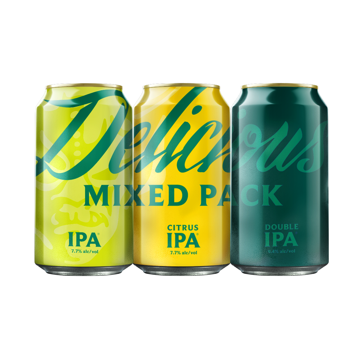 Two cans each of three decidedly Delicious beers. The original Stone Delicious IPA, Stone Delicious Citrus IPA (brewed with sweet orange peel), and the massive 9.4% Stone Delicious Double IPA.